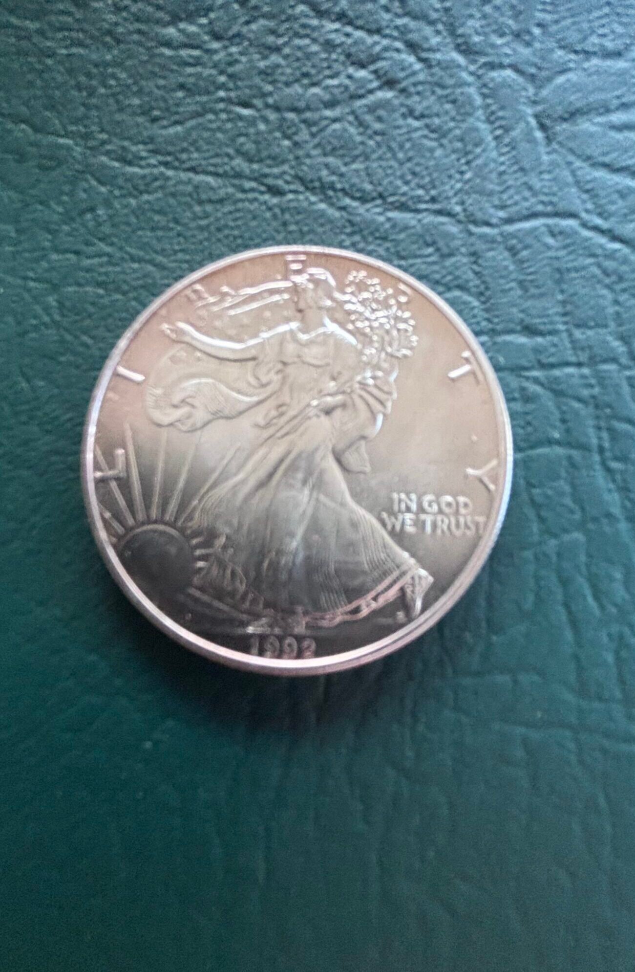 Discover the classic 1992 Silver Eagle coin, distinguished by its awe-inspiring rainbow-colored pattern across the top. This remarkable collectible comes with beautiful colors on the coin.